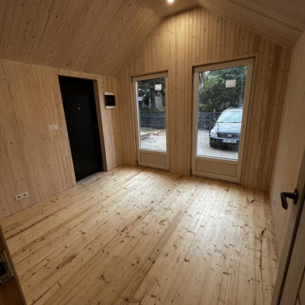 Seinad on viimistletud puidust vooderdisega, mis loob sooja ja hubase õhkkonna, ning põrand on valmistatud naturaalsest laudisest.